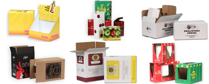 Transportna in prodajna embalaža za stekleno ali PET embalažo v različnih kvalitetah valovitega kartona, raznovrstnih konstrukcij in dimenzij, v flexo ali offset tehniki tiska, oplemenitena s plastifikacijo ali lakom, za ročno ali avtomatsko pakiranje.